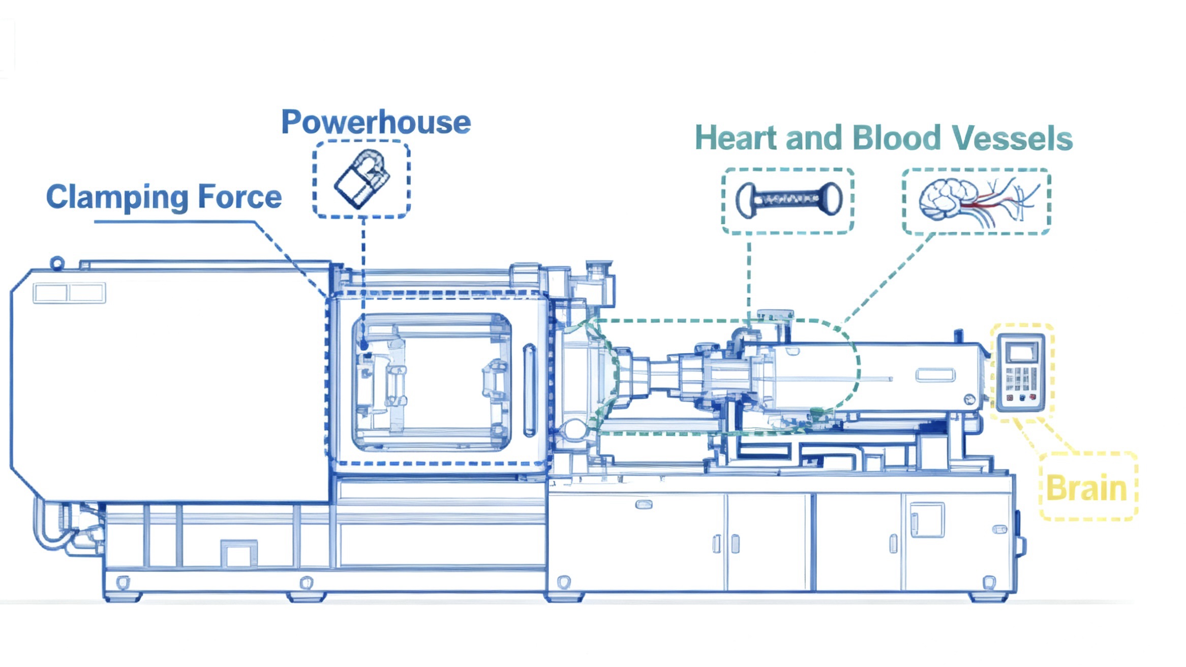 - The Clamping System: The "Powerhouse" - This robust assembly provides the immense force necessary to securely close and hold the two halves of the mold together under extreme pressure during injection. Think of it as the muscle that prevents the molten plastic from escaping the mold cavity.